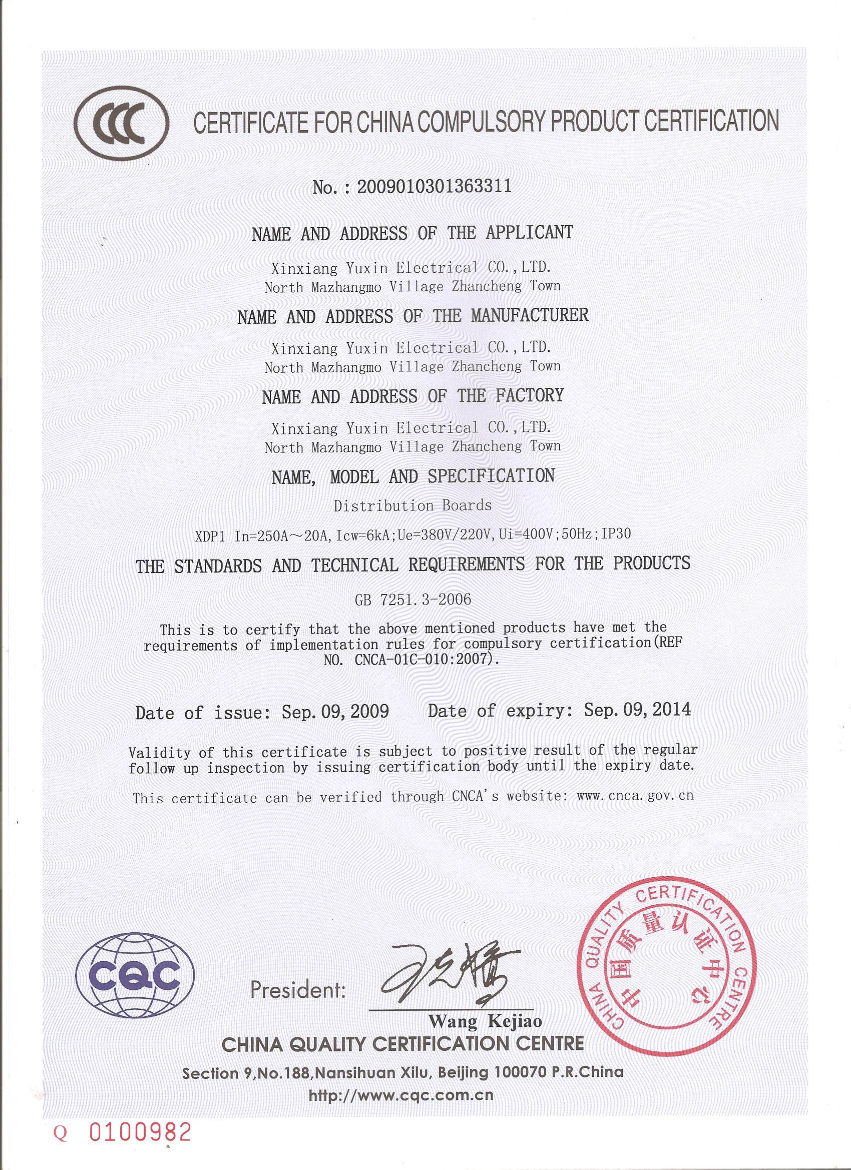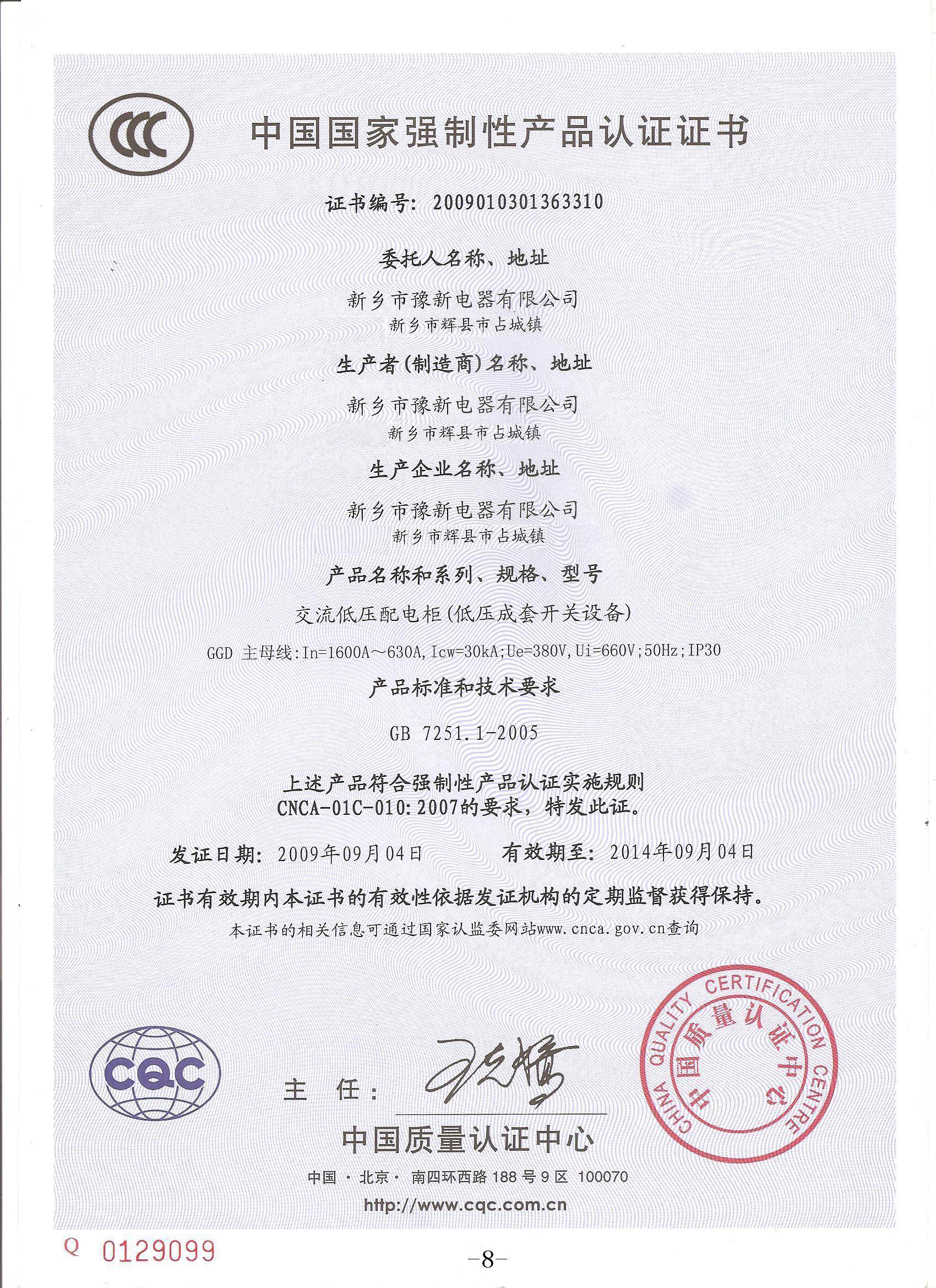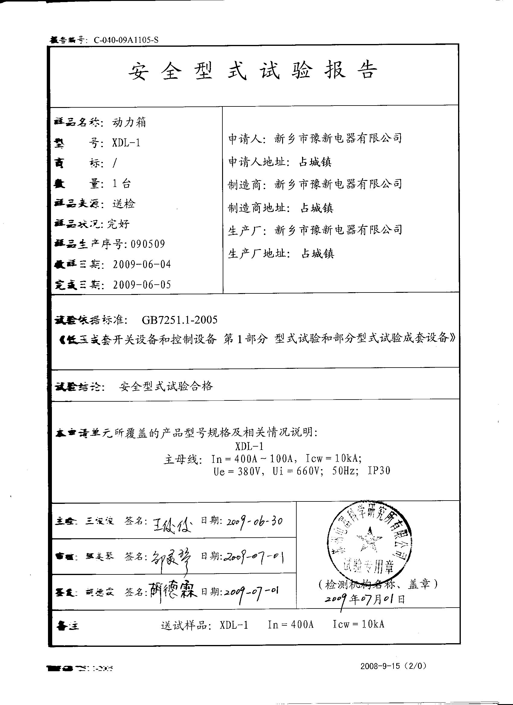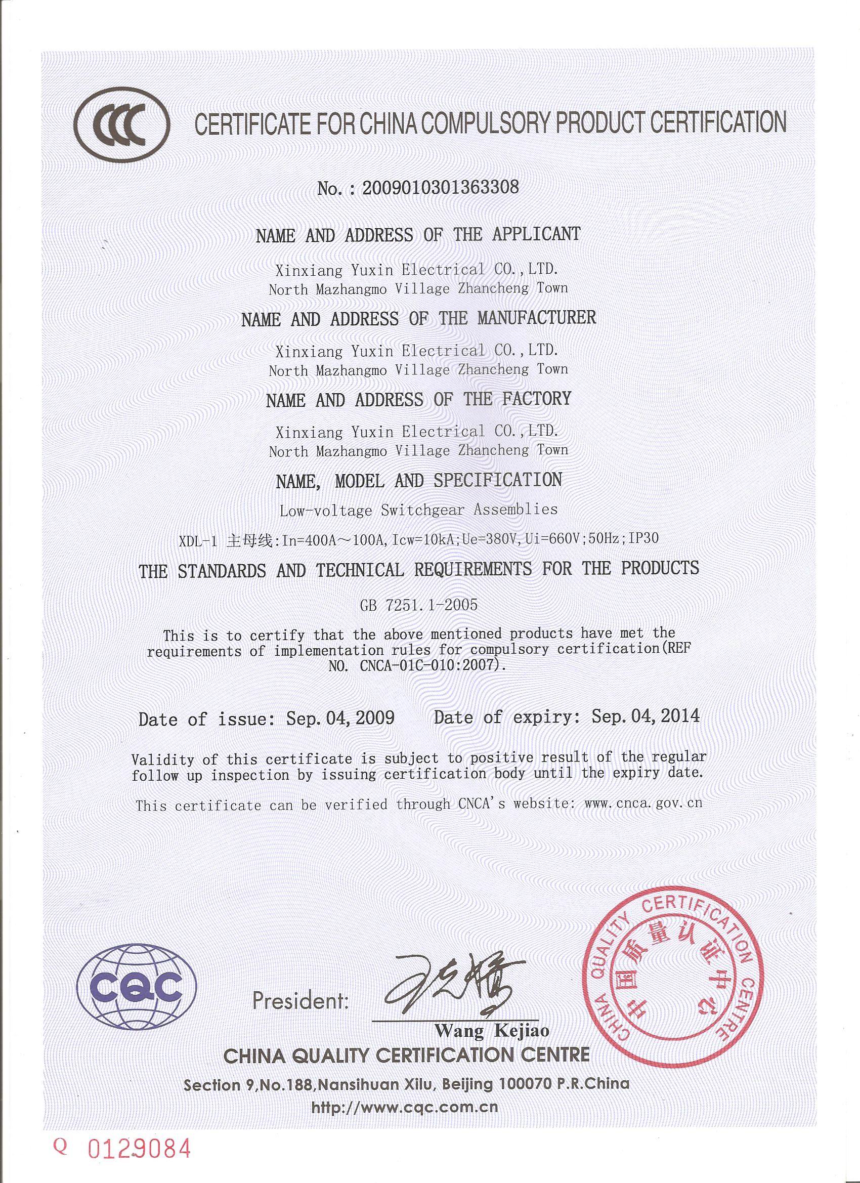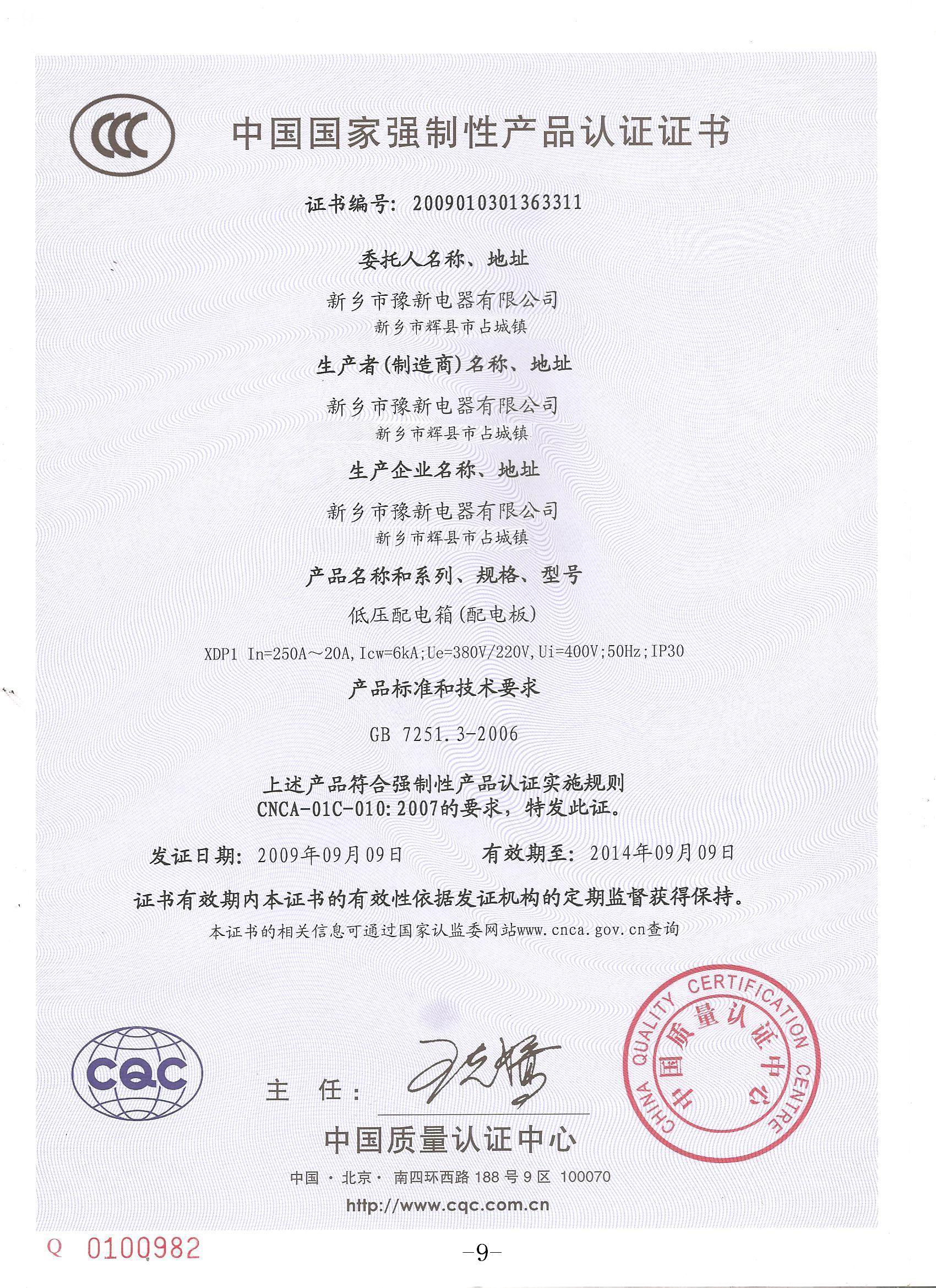 XDL1-400動力控制箱國家3C認(rèn)證證書{中}