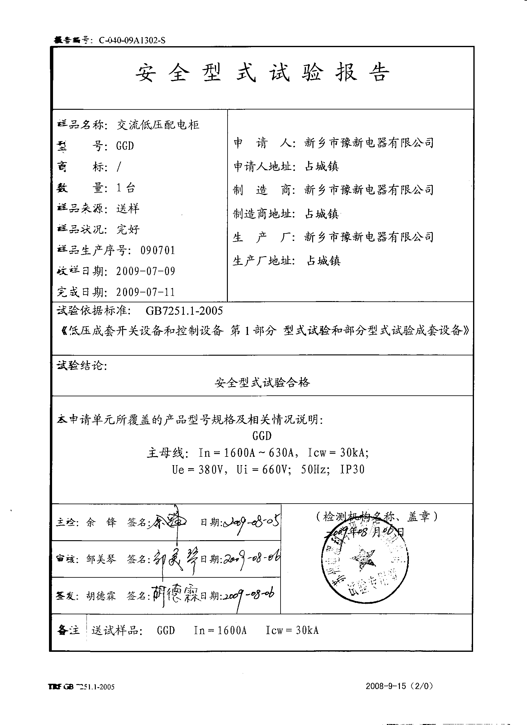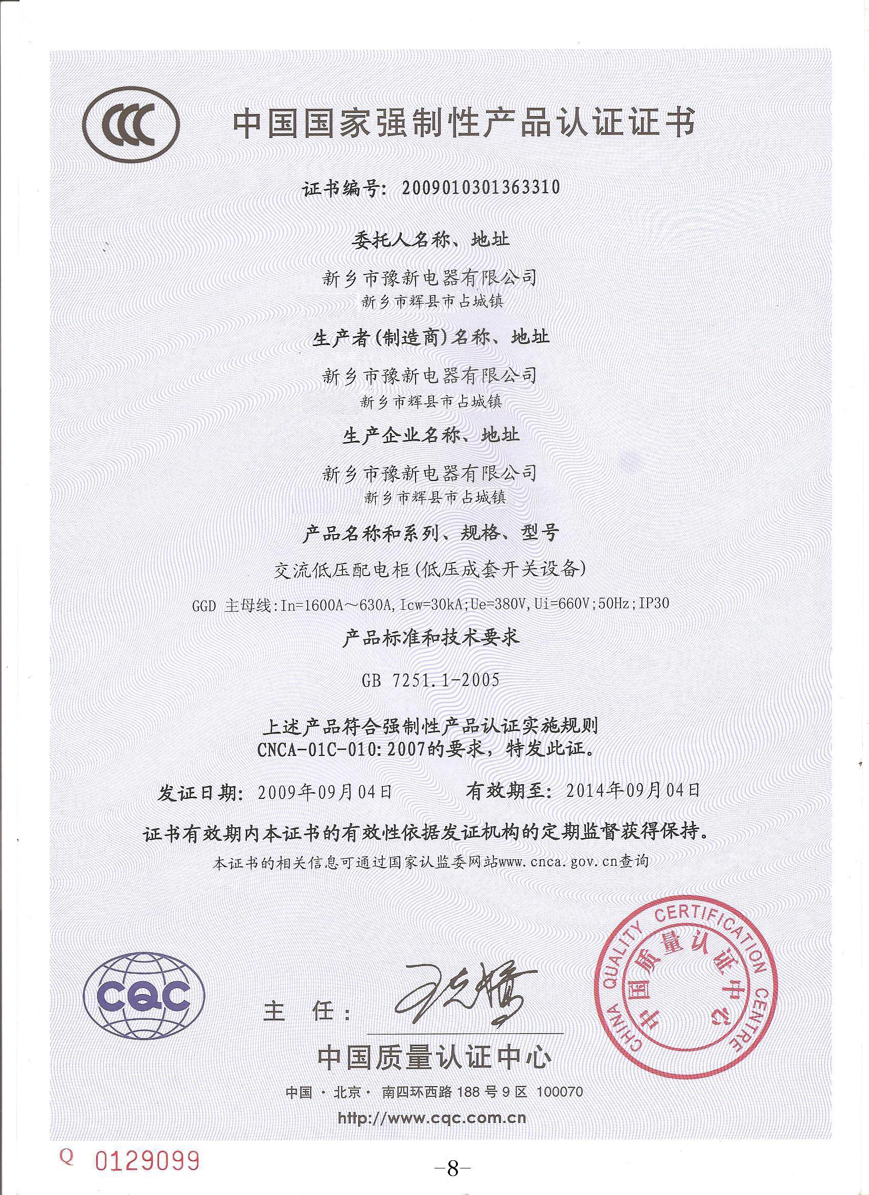 GGD低壓開關(guān)柜3C國家強制認證證書{中}